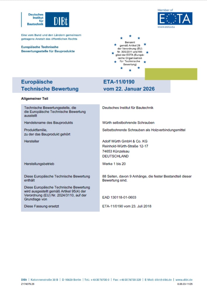 Nun wurde die ETA-11/0190 einer umfangreichen Überarbeitung unterzogen - mit dem Ziel, die leistungsfähigste Zulassung für ASSY® Schrauben aller Zeiten aufzubauen.