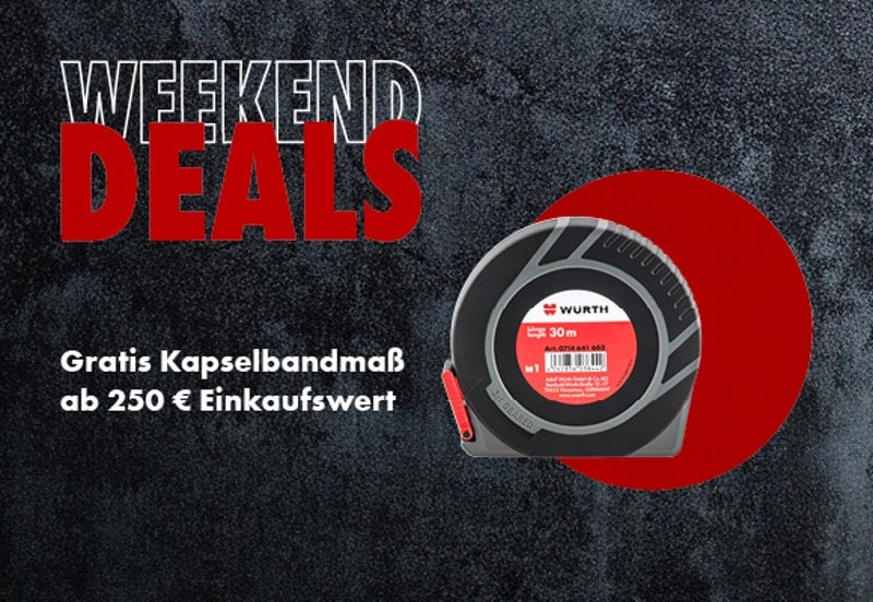 Mit den Würth Weekend Deals sichern Sie sich jede Woche exklusive Rabatte, Sonderangebote und Gratis-Zugaben. Das Beste: Die Deals wechseln jede Woche! Von Freitag bis Sonntag können Sie sich reduzierte Preise und besondere Aktionen sichern – Nur im Online-Shop oder der Würth App. Jede Woche reinschauen und sparen!