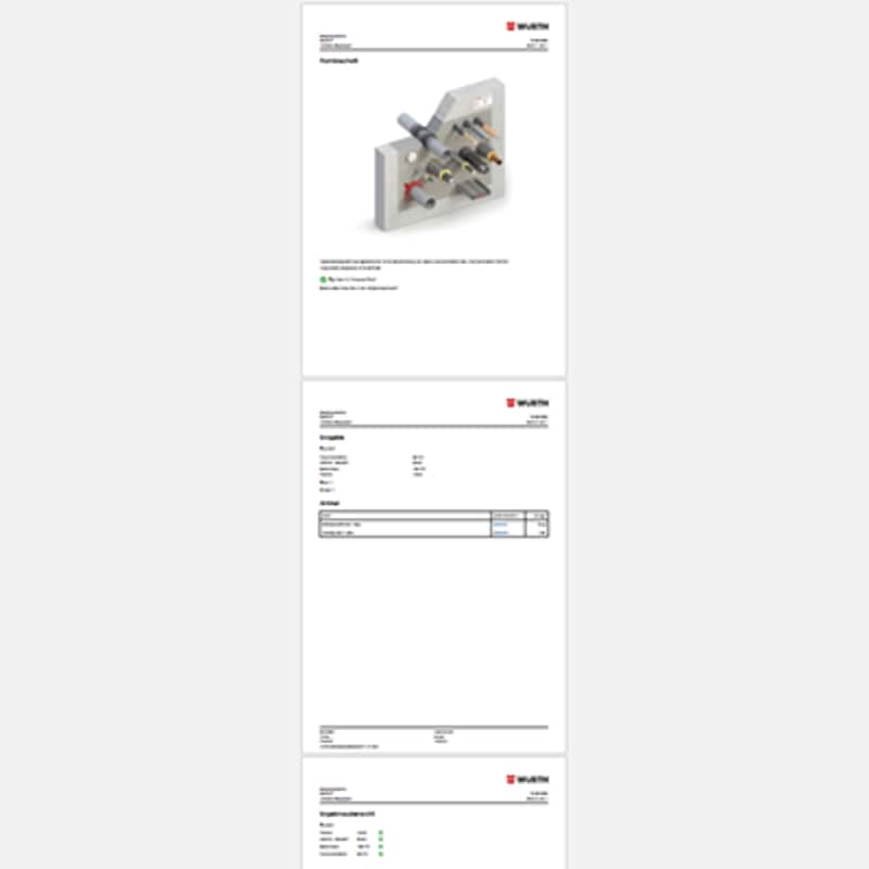 Zusätzlich können Projektdaten ergänzt und zur Dokumentation ein PDF generiert werden. Die Artikelliste ist direkt mit dem Würth Online-Shop verknüpft. Mit einer gültigen Würth Kundennummer können dort Kalkulationen durchführt oder Bestellungen unmittelbar ausgelöst werden.