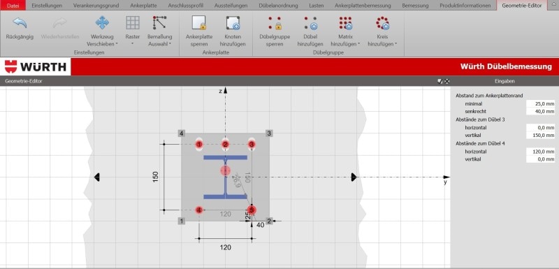 Mit dem Geometrieeditor kann individuell Ankerplatte und Dübel Positionierung angepasst werden.