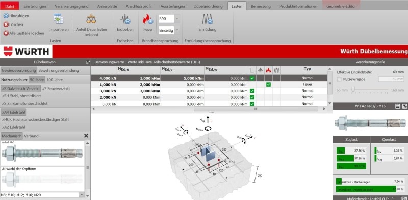 Mit der Würth Dübel Bemessungssoftware gelingt die Aufgabe sehr schnell und intuitiv. Das Ganze jederzeit nachvollziehbar und absolut verlässlich auf Basis der aktuellen Normen und Regelwerke.