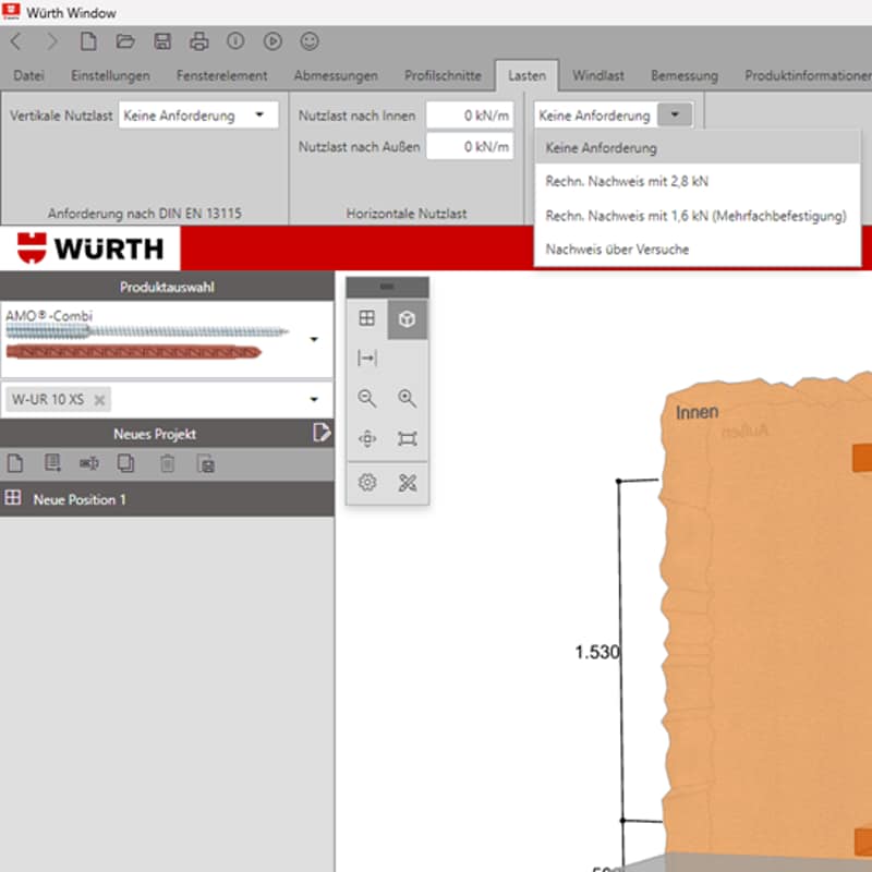 Die Würth Fenstersoftware unterstützt Sie von der Ermittlung der Einwirkungen über die zulässige Anordnung der Befestigungsmittel bis hin zur Nachweisführung. Damit ist auch erfahrenen Planern und Planerinnen geholfen, dass sie Fensterbefestigungen effizient und nach den anerkannten Regeln der Technik planen können.