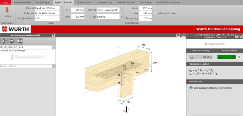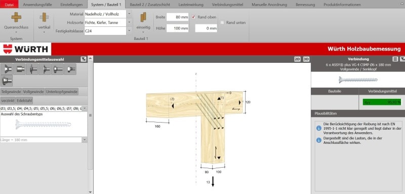 Die Würth Holzbausoftware unterstützt effektiv bei der Bemessung von Holzschrauben in einer großen Bandbreite an Einbausituationen: Schraubverbindungen, Trägeranschlüsse oder Verstärkungsmaßnahmen gelingen mit ihr schnell und nachvollziehbar.