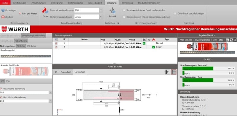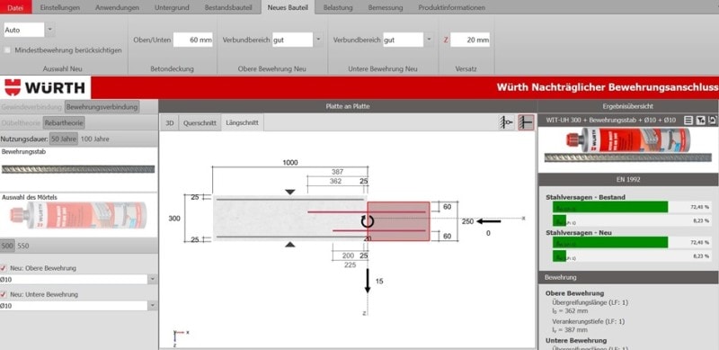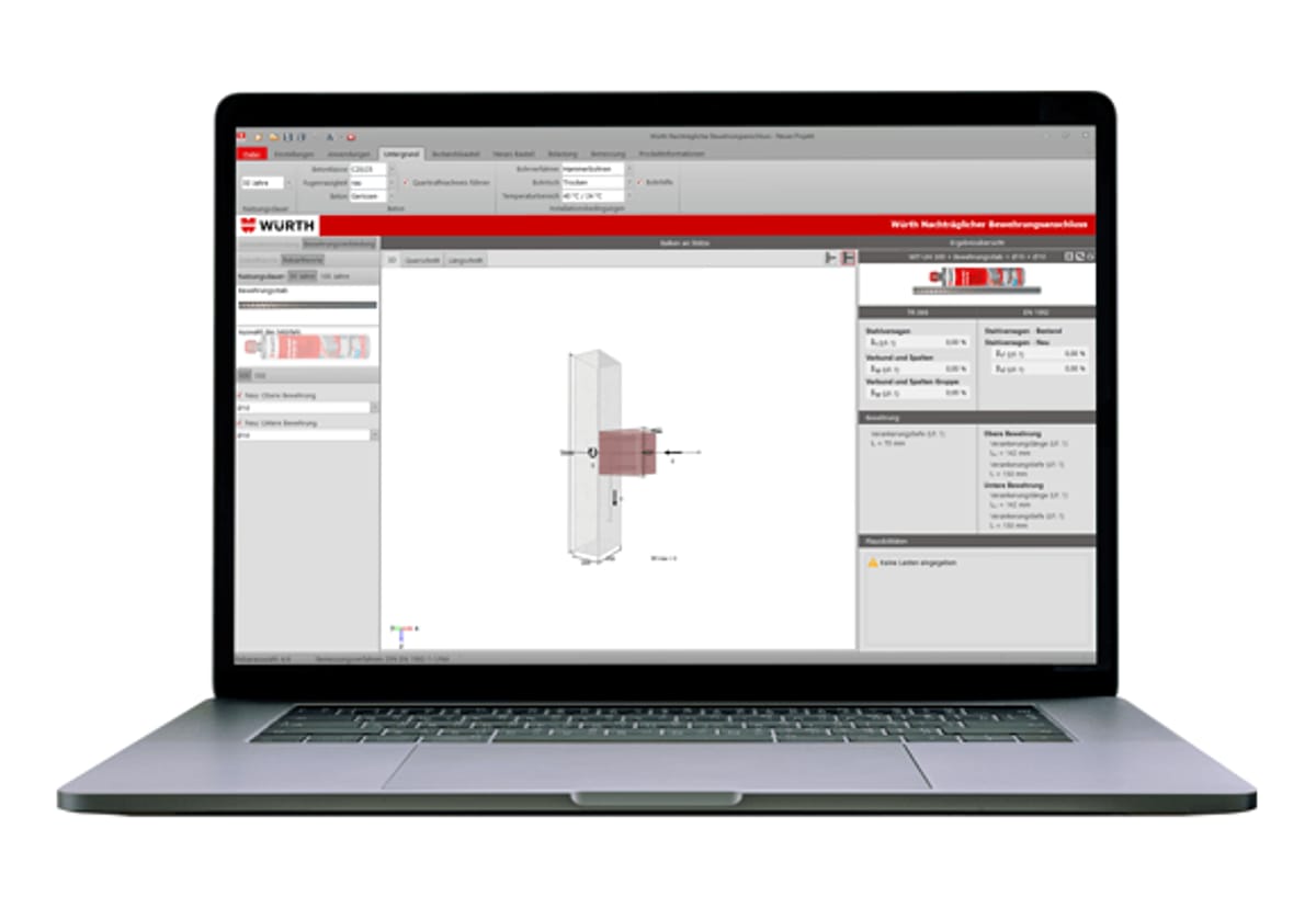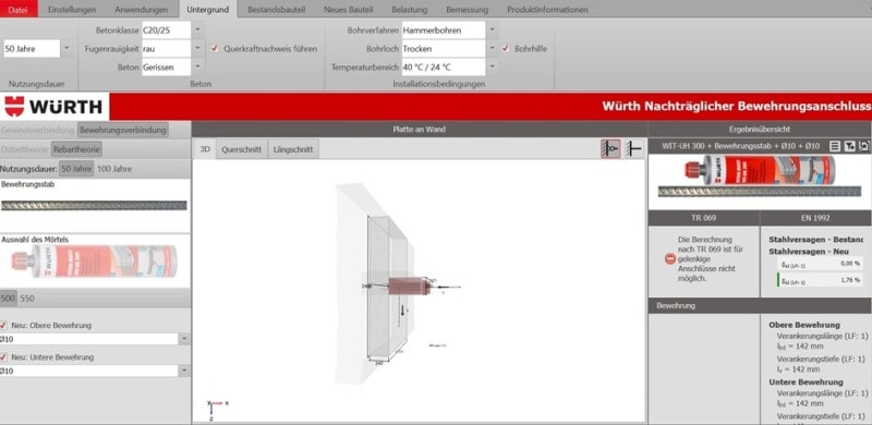 Mit der Würth REBAR Bemessungssoftware gelingt die Bemessung unter Berücksichtigung der geometrischen Randbedingungen sehr zeitsparend.
