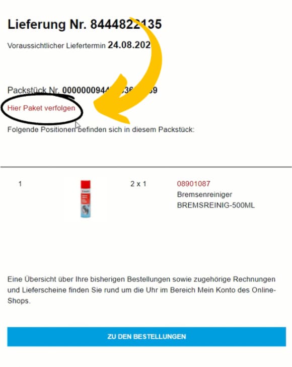 - Klicken Sie auf den rot markierten Link "Hier Paket verfolgen", um die Sendungsverfolgung des Versanddienstleisters einzusehen.