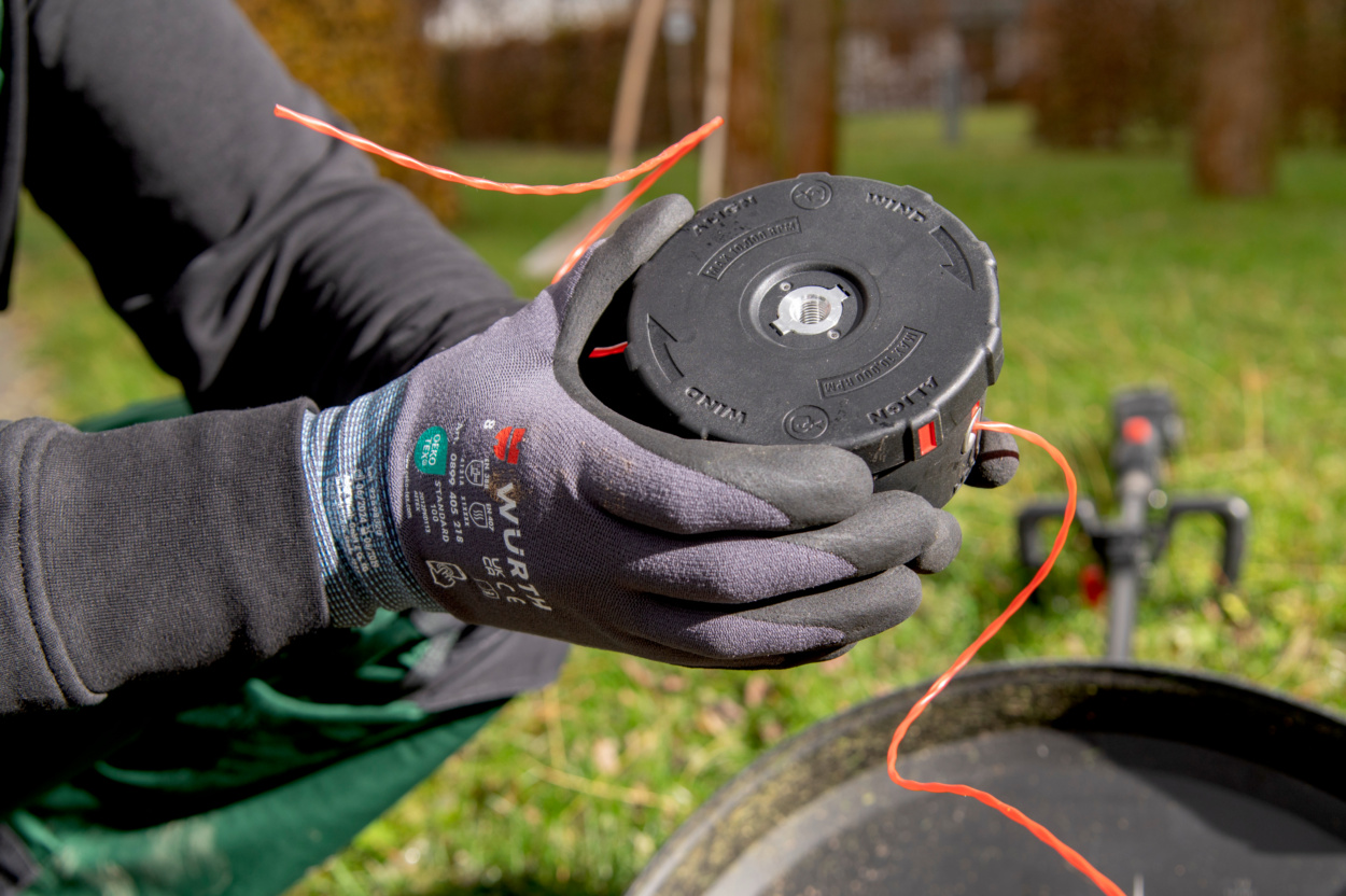 Halten Sie Schneidwerkzeuge stets scharf und sauber. Sorgfältig gepflegte Schneidwerkzeuge mit scharfen Schneidkanten verklemmen sich weniger und sind leichter zu führen. Beachten Sie die Herstellerangaben für Wartungsmaßnahmen und Wartungsintervalle wie Schärfen von Heckenscheren und Kettensägen, dem Tausch von Filtern bei Laubbläsern oder Fadenwechsel beim Rasentrimmern. Für effizientes Arbeiten erlaubt der Würth M-CUBE Rasentrimmer den schnellen und einfachen Fadenwechsel mit einer praktischen Mähfadenspule, die eingerastet und mit einer Schraube fixiert wird.