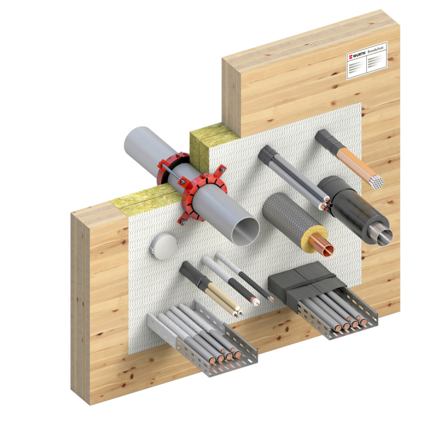Alternativ dazu bietet WÜRTH vereinfachte Systeme für die Abschottung in Holzbauteilen. Sie stellen eine nichtwesentliche Abweichung vom Anwendbarkeitsnachweis der jeweiligen Abschottung dar, da von der Bauart der klassifizierten Bauteile (Wand/Decke) formaljuristisch abgewichen wird. Der direkte Einbau kann aber durch Brandprüfberichte belegt und zusätzlich durch Gutachten bestätigt werden. Einige Beispiele: