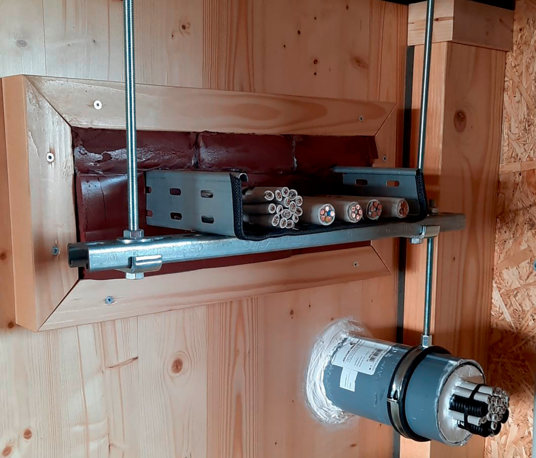 - Kabelabschottung in Holzdecken und – wänden mit Kabelröhre, Stopfwolle und einer Ablationsbeschichtung, die im Brandfall für Kühlung sorgt.